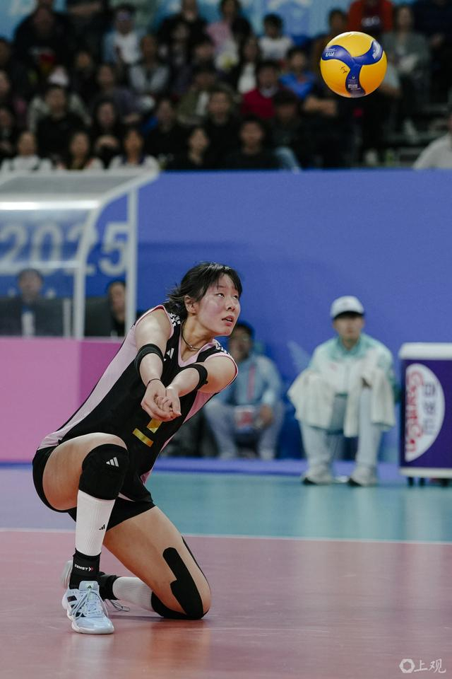 在队长仲慧领衔的一群老将和强力外援的鼓励下,赵喆熙和队友很快适应节奏。她连续得分,成为上海女排拿下第二局的关键人物,也帮助球队提前锁定了小组头名。第三局,双方教练都开始大面积轮换阵容,陈厚羽、赵喆熙依旧留在场上,打到了最后一刻。