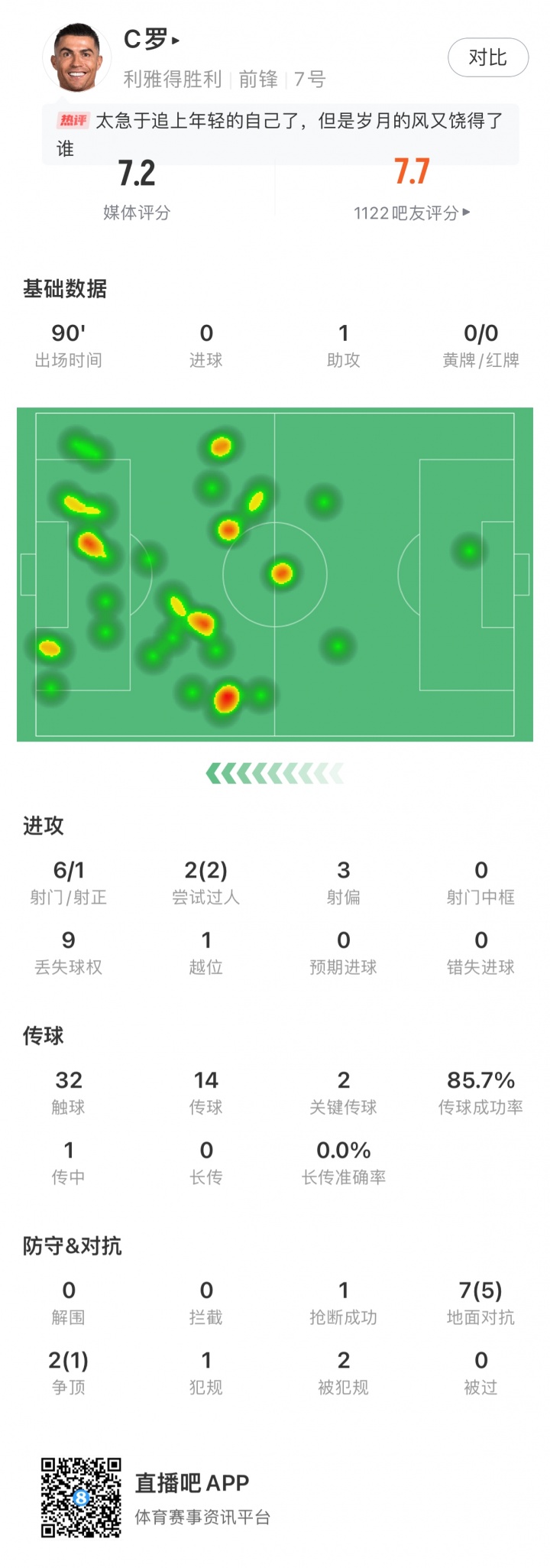 C罗本场贡献一次助攻,六次射门一次射正,完成两次过人及七次对抗五次成功 日期:2025-09-06 21:45:51 作者:xiaoqiao 栏目:西甲 浏览:88 评论:0 8月19日沙特超级杯半决赛,利雅得胜利在少一人作战的情况下以2-1力克吉达联合,成功挺进决赛。C罗首发出场并打满全场,比赛中送出关键助攻。C罗全场数据如下C罗助攻菲利克斯完成破门 延伸阅读: 星空体育app-马卢阿奇:我五年前才开始打球,现在每天都在学习新东西 星空体育app-加布里埃尔门前补射被放倒,裁判经VAR确认后判罚没有点球 【南美杯】弗鲁米嫩塞vs卡利美洲首发阵容名单(2025年08月20日) 周薪近40万镑!记者:维尔茨将在利物浦拿到顶薪,签5年合同 75双雄不老!奥沙利文第2威廉姆斯第6,前10占两席 C罗本场贡献一次助攻,六次射门一次射正,完成两次过人及七次对抗五次成功 标签: 上一篇:星空体育官网-当选南美最佳教练 阿图尔·若热不接葡国总统电话 下一篇:武汉媒体展望三镇客战申花:发挥年轻人冲击力,未必不是合适选择